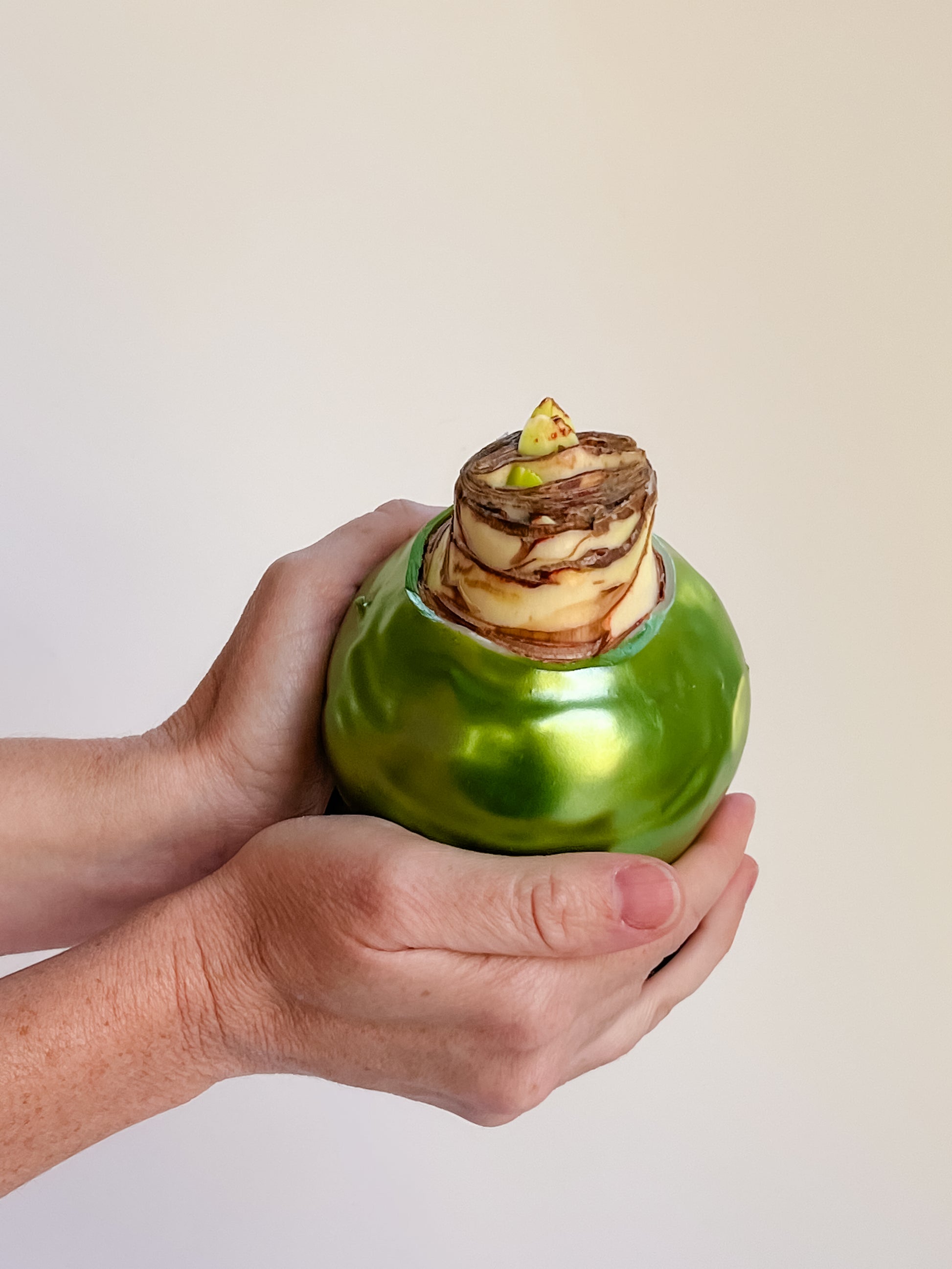 A fresh take on festive décor, this amaryllis bulb is coated in a luminous green wax and finished with crisp white blooms. Simple, joyful, and effortless—just place it anywhere and enjoy weeks of natural beauty.