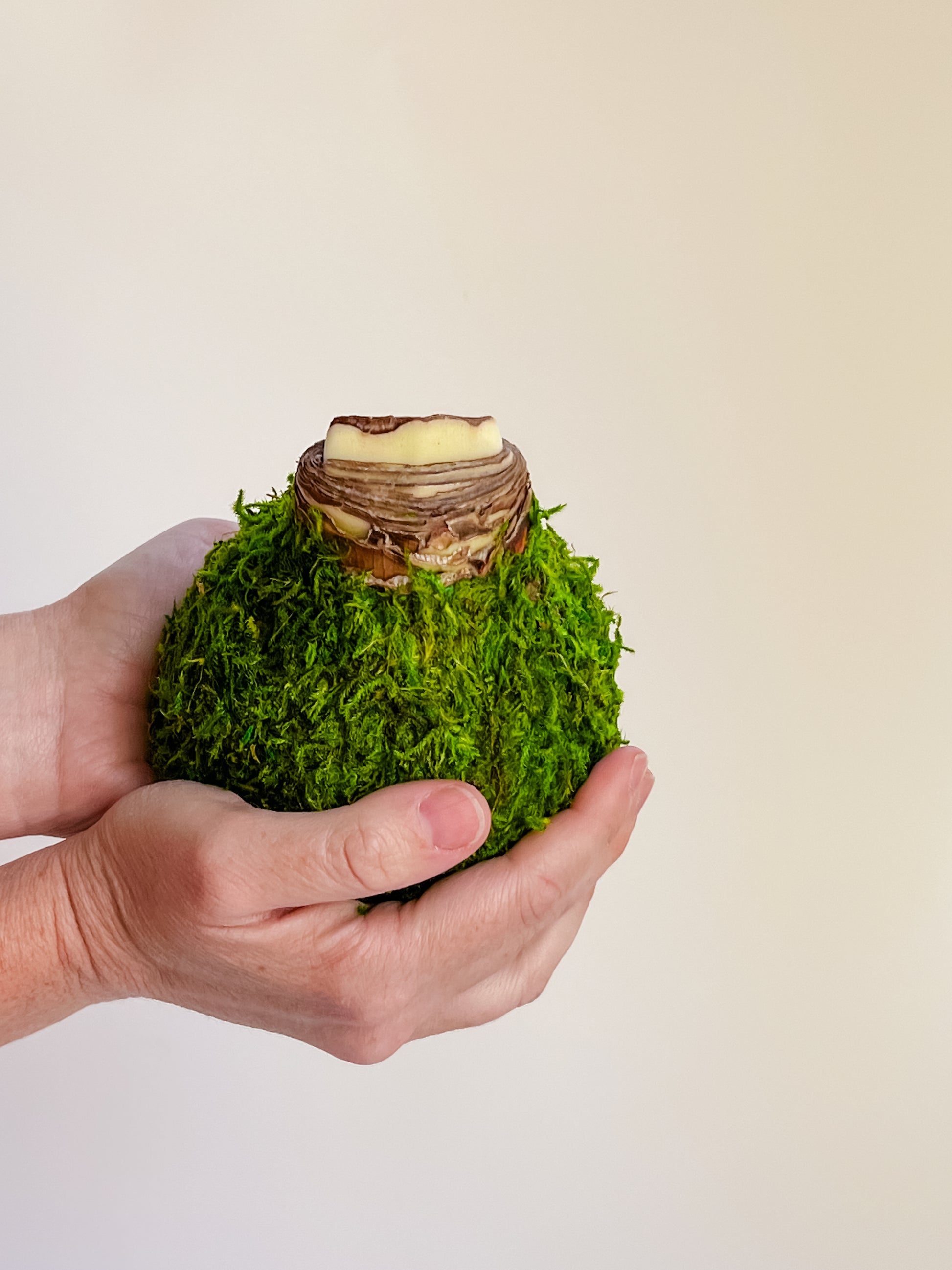 Wrapped in natural green moss, this bulb has an organic, earthy finish that feels both fresh and timeless. Its white blooms rise beautifully from the mossy base, bringing a touch of nature indoors.